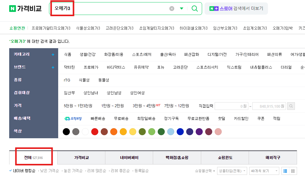 간단히 네이버에서 오메가3를 검색하면, 검색결과가 52만개가 나옵니다. 종류별/가격별로 엄청나게 많지요.